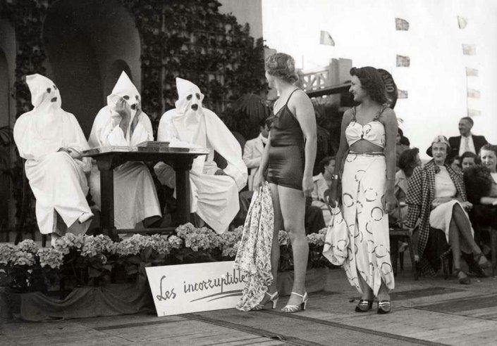 Две дамы в купальниках проходят мимо членов жюри конкурса красоты, замаскированных и, следовательно, неподкупных. Франция, 1937 год.