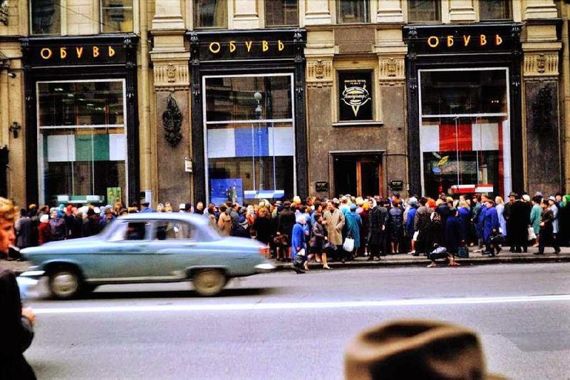 Очередь у обувного магазина: в продажу «выкинули» дефицитный товар. СССР, 1968 год.