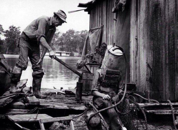 Ловец жемчуга на Миссисипи готовится к очередному "заходу". В качестве шлема - старый топливный бак от автомобиля. В нем он мог погружаться на глубину до 21 метра и быть под водой до 1,5 часа, 1938 год