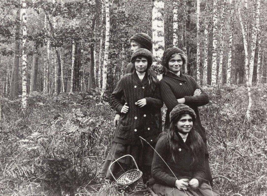 Великие княжны Ольга, Татьяна, Мария и Анастасия на прогулке в Беловежской пуще, 1913 год.