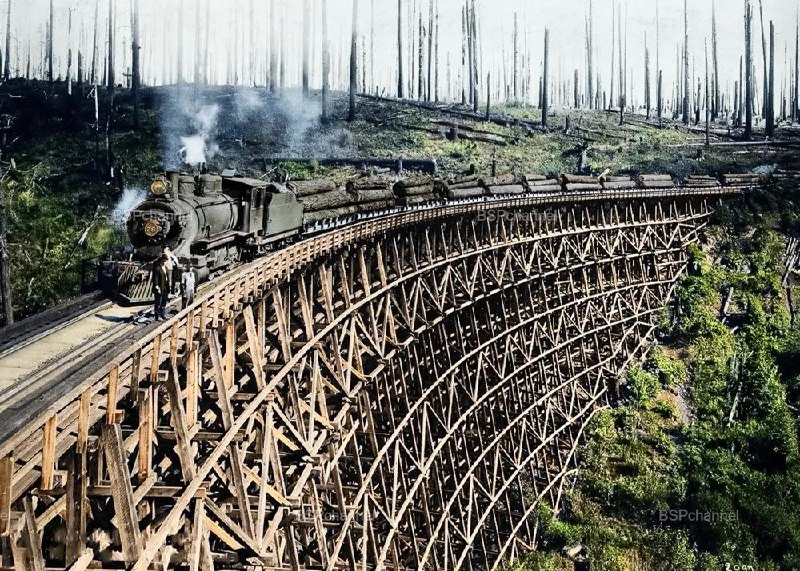 Лесовоз на железнодорожном мосту в США, 1918 год.