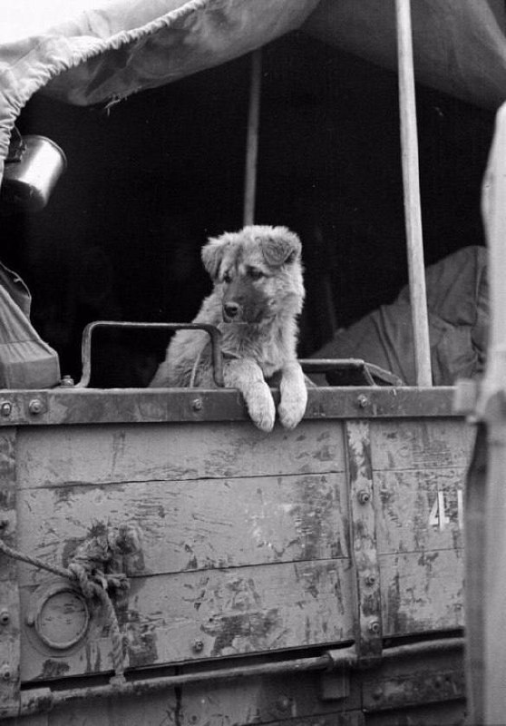 Собака покидает Северную Корею вместе с военной колонной ООН, декабрь 1950 года