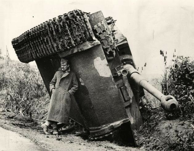 Британский солдат прячется от дождя под перевёрнутым танком “Тигр”, Италия 1944 г.
