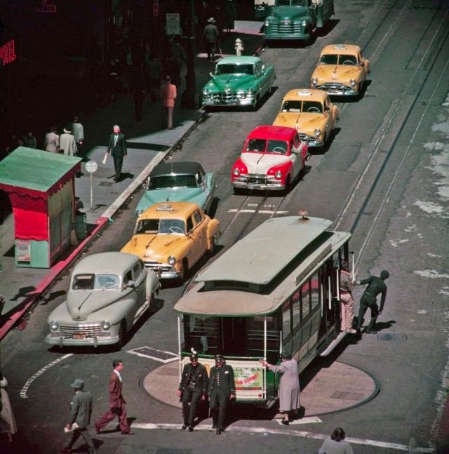 Разворот канатного трамвая на конечной остановке в Сан-Франциско, 1950-е годы.