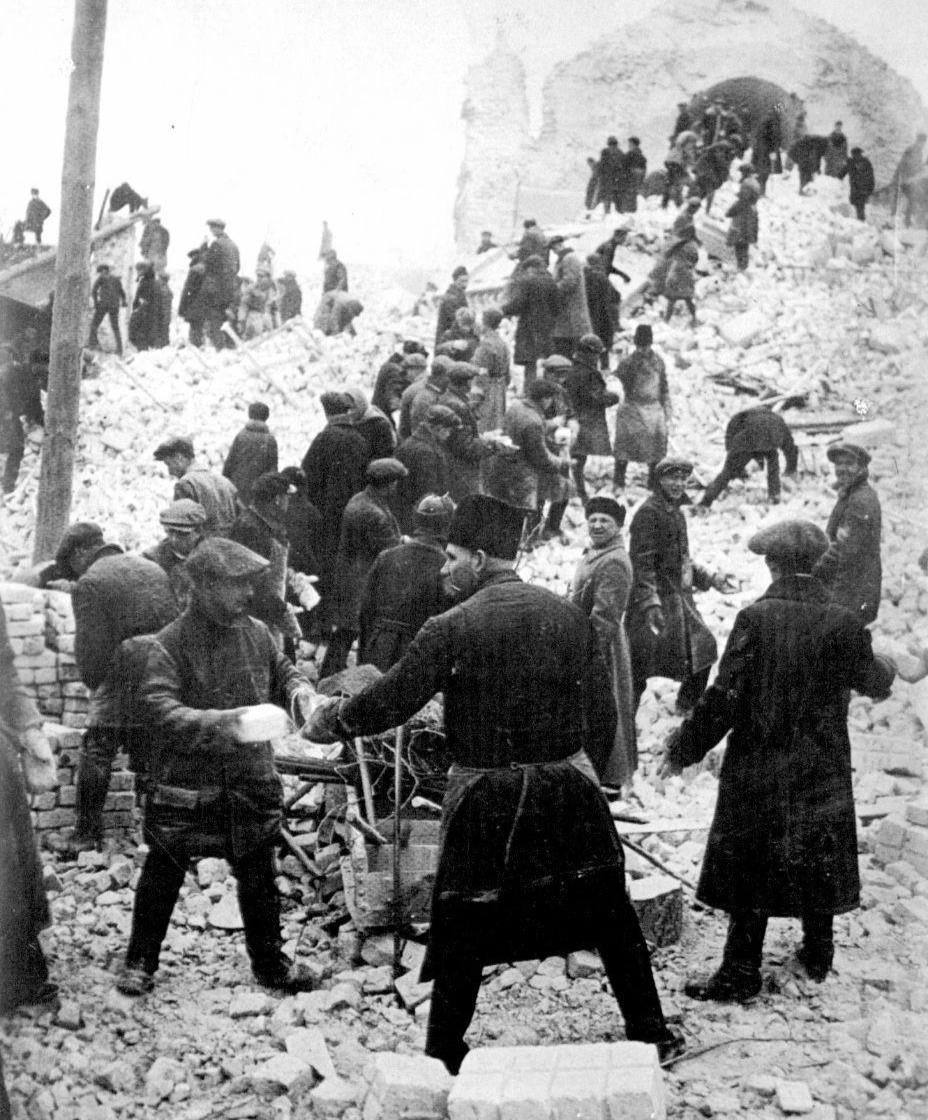 Субботник по разбору разрушенных зданий Симонова монастыря в Москве, 1930 год.