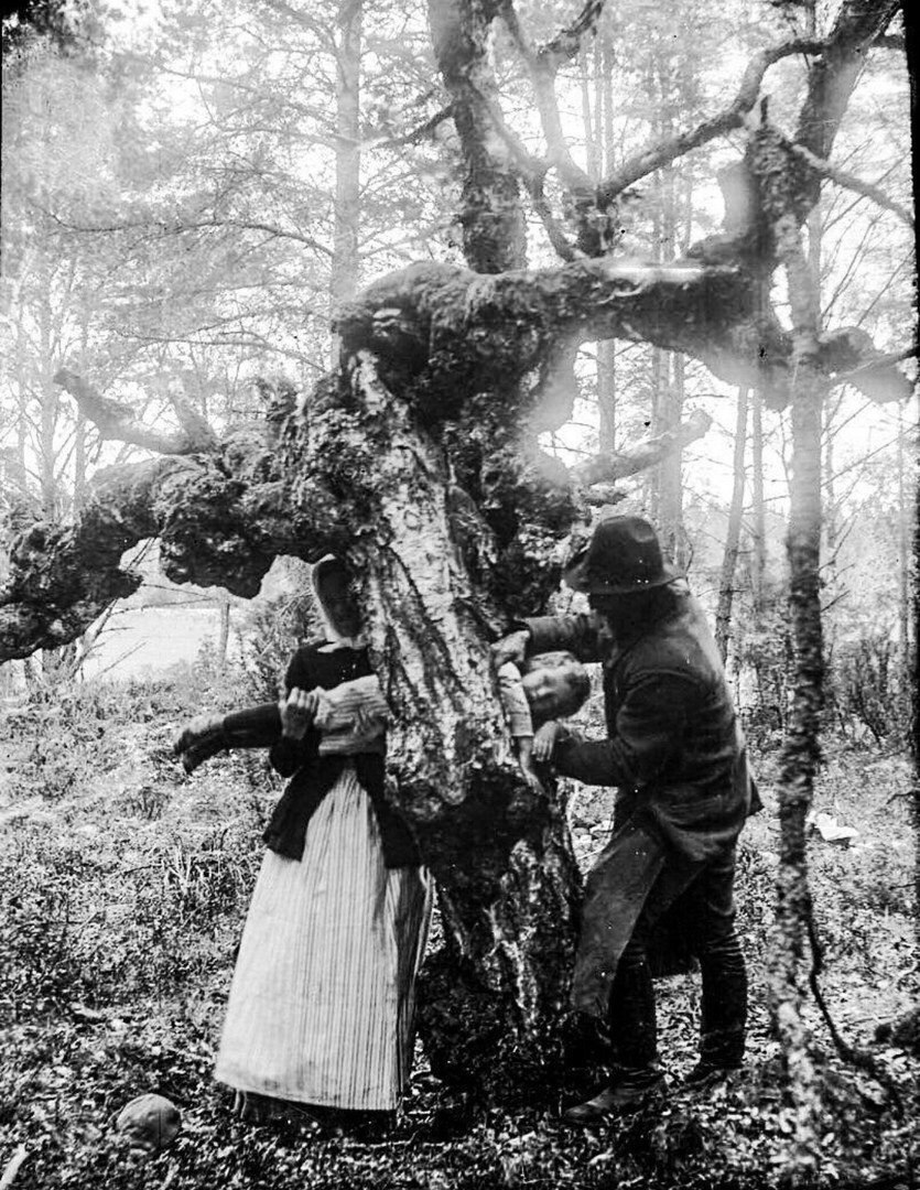 Попытка исцелить ребенка-рахитика путем протаскивания через дупло в целебном дереве. Швеция, 1918 год.