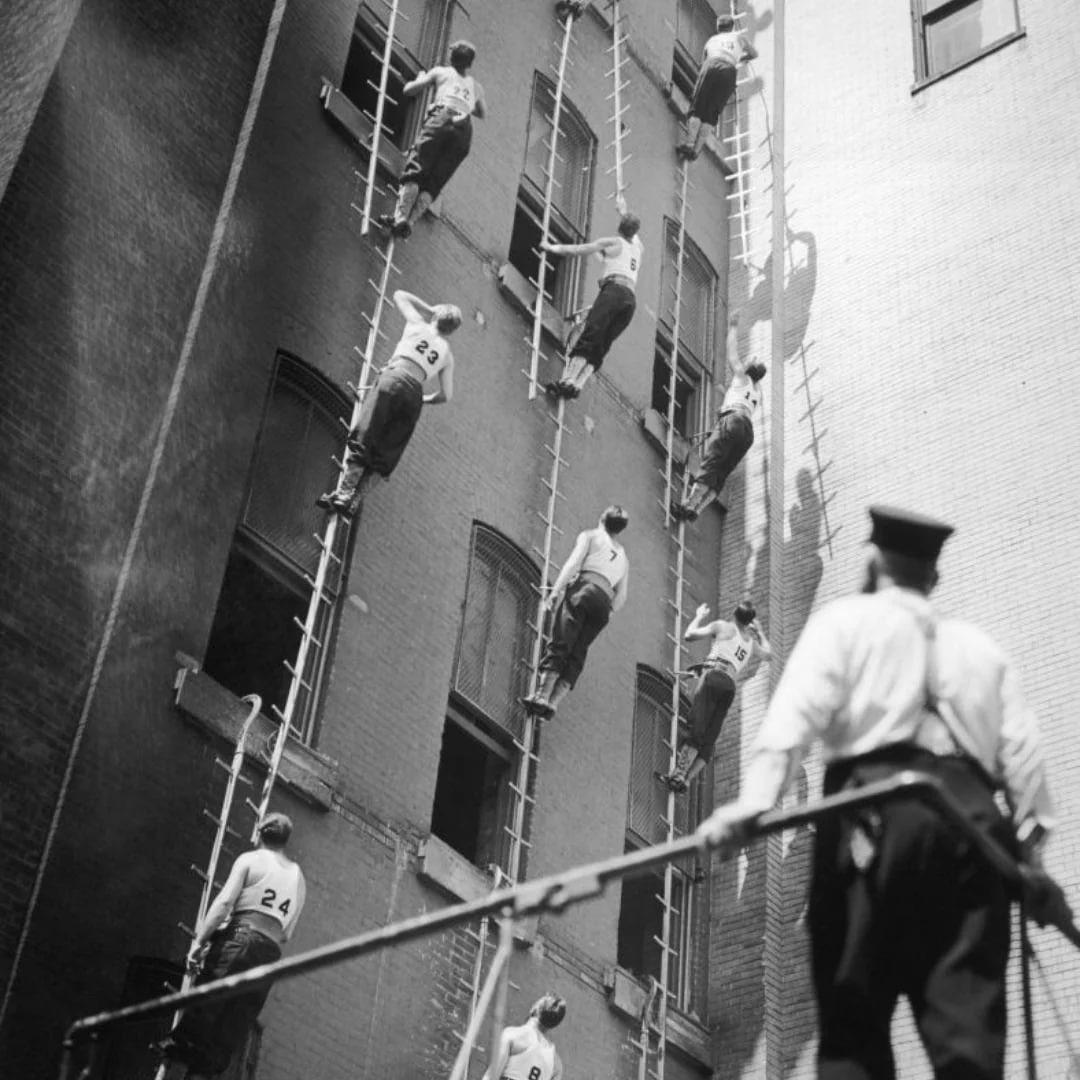Около 1950 года в учебном центре Нью-Йорка пожарные-стажёры отрабатывают навыки подъема по стене здания.