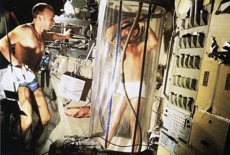 Космонавты Анатолий Березовой и Валентин Лебедев принимают душ на орбитальной станции «Салют-7», 1982 год.