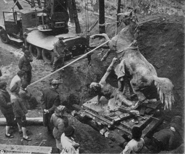 Скульптуры коней с Аничкова моста в Ленинграде пережили войну, будучи спрятанными под землей. Их подняли на поверхность в 1945 году.