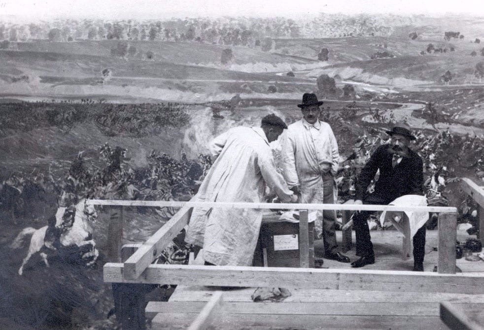 Франц Рубо (в центре), генерал-лейтенант Борис Михайлович Колюбакин (справа) и Карл Беккер работают над панорамой «Бородино». Мюнхен, 1911 год.