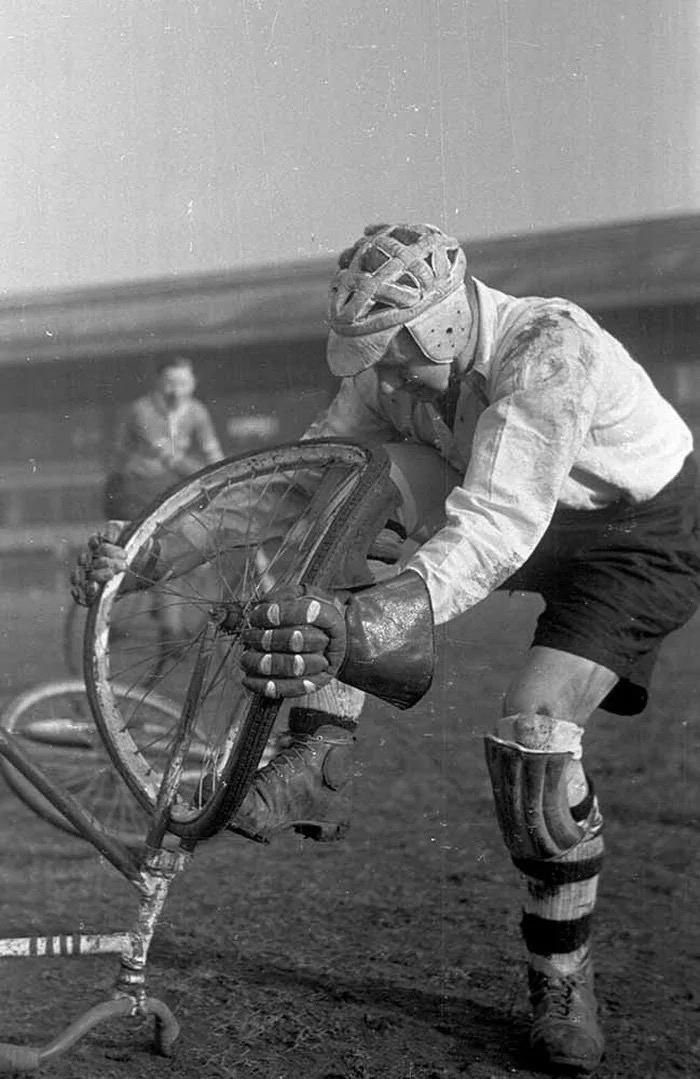 Знаменитый велогонщик Джордж Брейк регулирует колесо во время гонки в Лондоне, 1948 год.