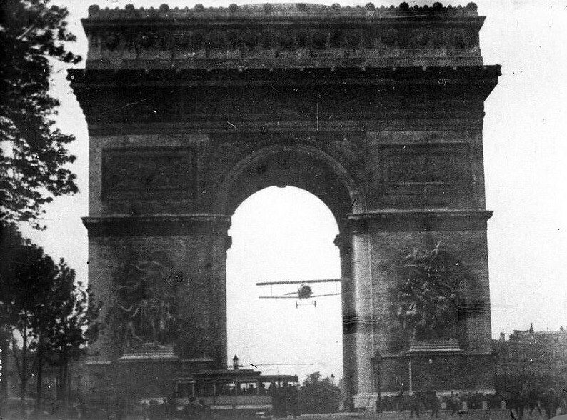Лётчик Шарль Годфруа пролетел через Триумфальную Арку в Париже, 1919 год.