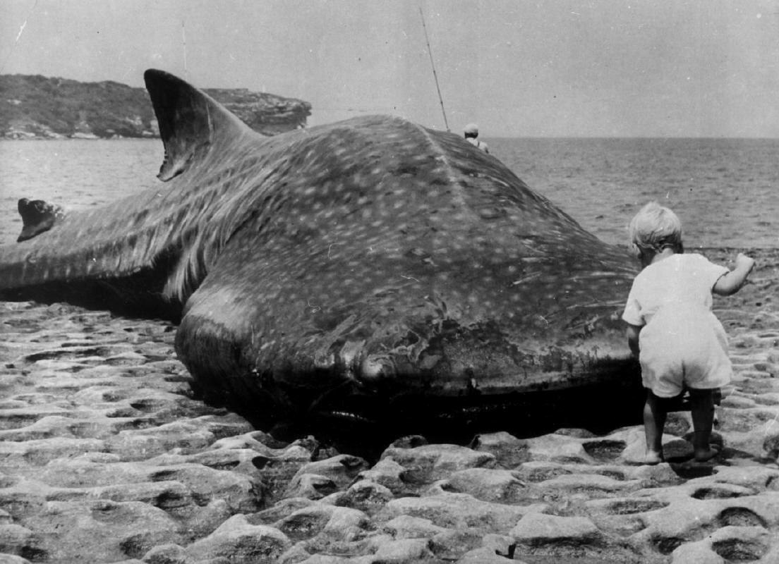 Маленький ребенок и огромная китовая акула выброшенная на побережье Австралии, 1965 г.