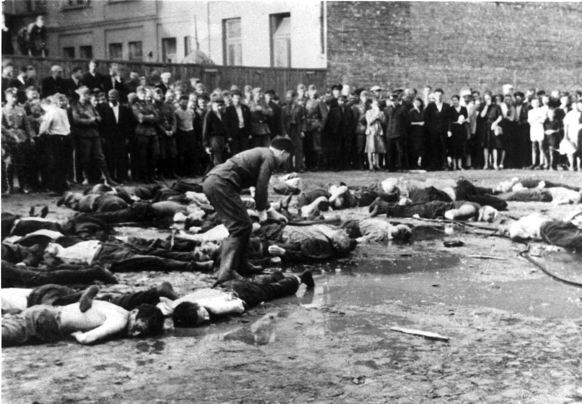 Каунас, 1941 год. В радости от освобождения от советской оккупации литовские националисты устроили еврейский погром. На фото один из них добивает раненого ломом.