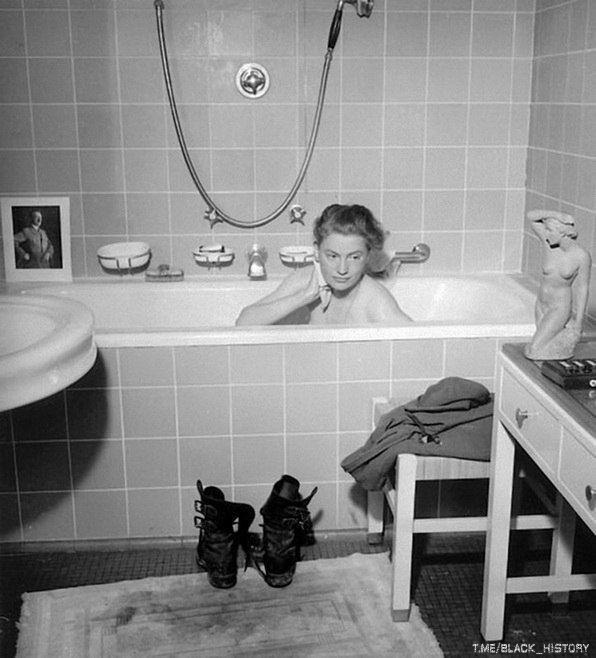 Американский военный корреспондент Элизабет Миллер принимает ванну в квартире Гитлера. Мюнхен. Германия. 30 апреля 1945 года.