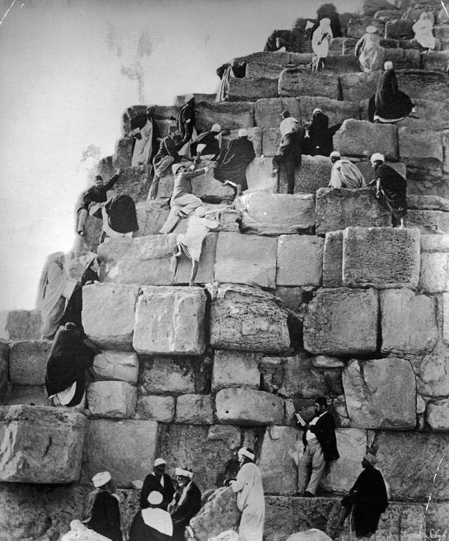 Египтяне помогают туристам подниматься по блокам пирамиды, Египет, 1880 г.