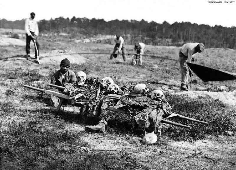 Бывшие рабы собирают кости солдат, погибших в битве за Колд-Харбор, спустя год после самой битвы, США, 1865 год.
