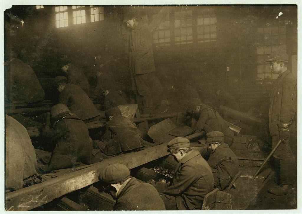 Человек справа - надзиратель. Он должен следить за работой детей, подгонять их, если подобное потребуется. На данном этапе дети руками отделяли уголь от сланца, глины и мусора. Пенсильвания, 1920-е.