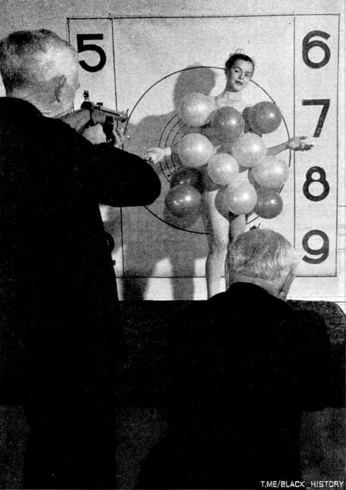 Во время ужина, устроенного оружейником Мелвином Джонсоном в 1947 году, гостям, преимущественно пожилым джентльменам, предлагалось пострелять из пневматических винтовок по воздушным шарикам, закреплённым на девушке. США.