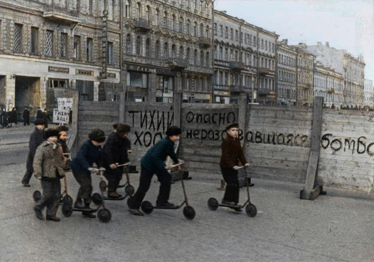 Блокадный Невский проспект. Ленинградские дети устроили гонки на самокатах, 1941 год.