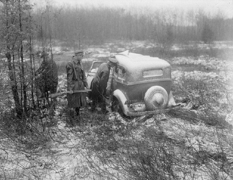 Машина на которой скрылись преступники ограбившие банк. Найдена брошенной за городом 1935 год.