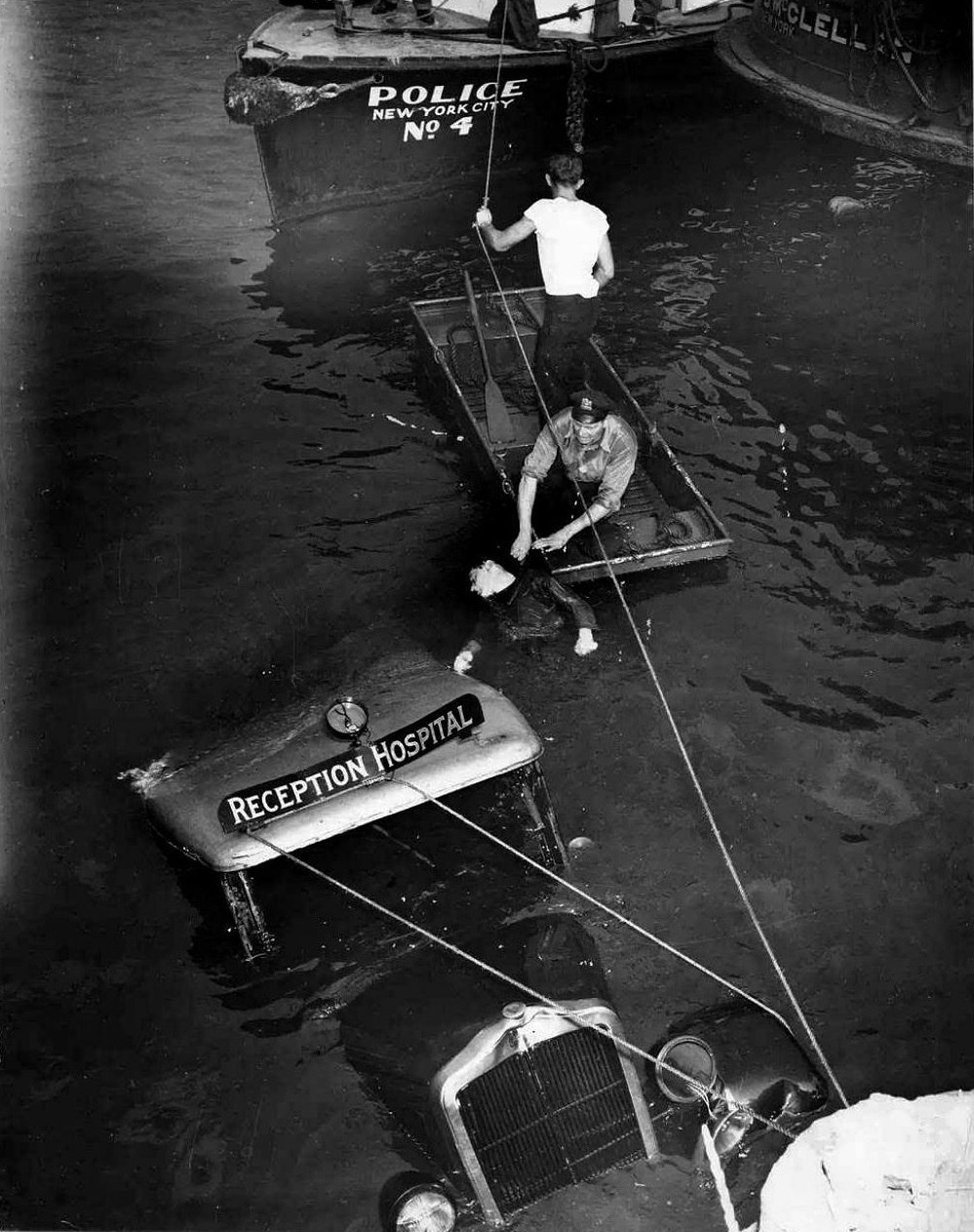 Полицейский достает из воды тело водителя скорой помощи, Нью-Йорк, 1943 год.
