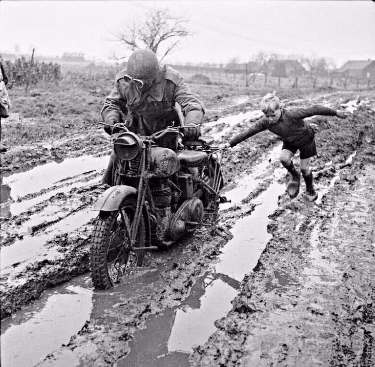 Голландский мальчик помогает выбраться из грязи британскому военному почтальону, 1944 год.