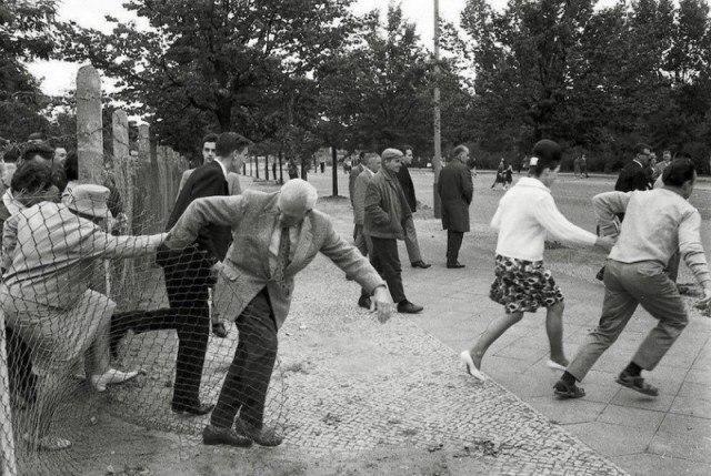 Жители Восточного Берлина бегут на Запад через дырку в заборе, пока пограничники не видят, 15 августа 1961, Берлин.