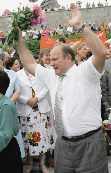 Геннадий Зюганов, пребывающий в состоянии эйфории, в период своей предвыборной кампании, Волгоград, 1996 год