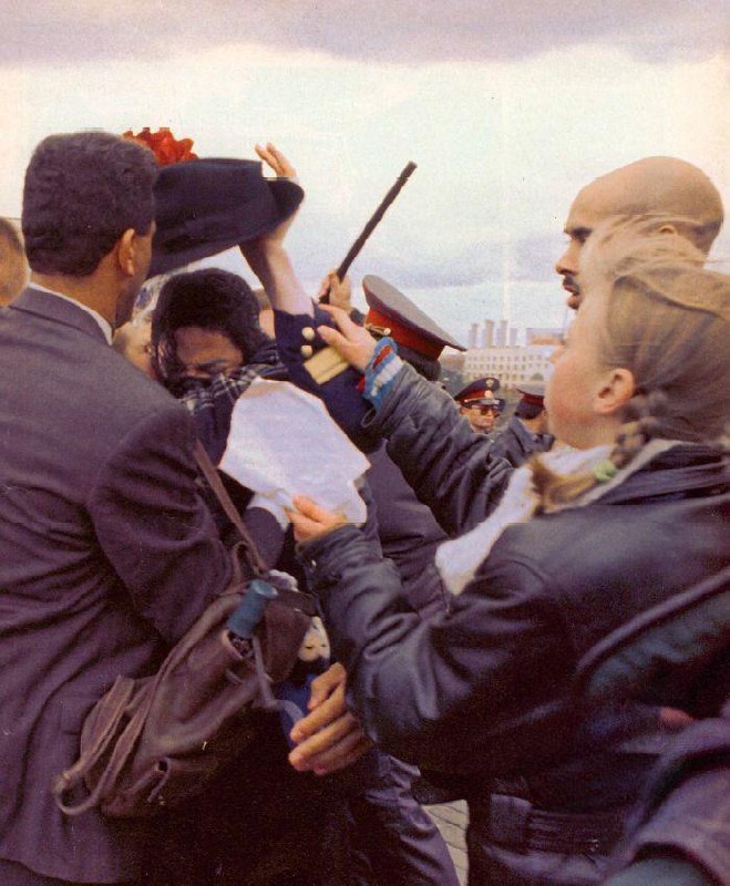 Спасающийся от свирепого неистовства российских фанатов Майкл Джексон, во время своего визита в Москву, 1996 год.