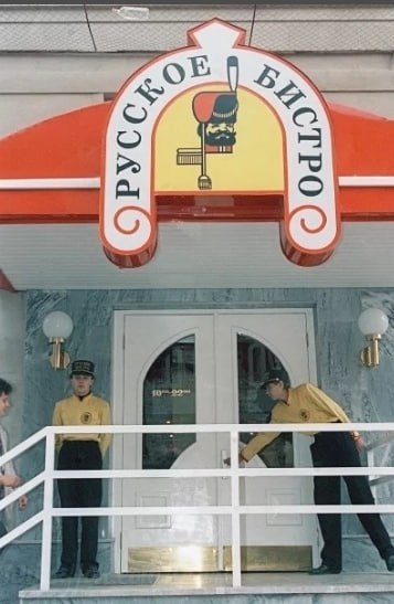 У входа в кафе «Русское бистро». Москва, 1990-е годы.