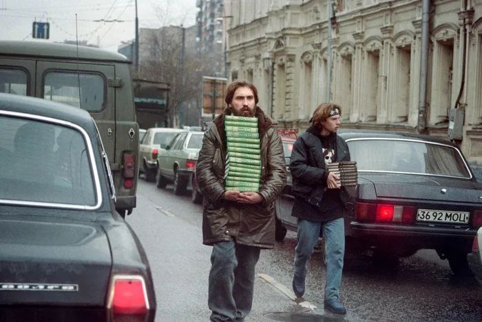 Уличные продавцы книг несут 15 томов произведений Александра Дюма и восемь томов Конан Дойля. Москва, 21 ноября 1994 года.