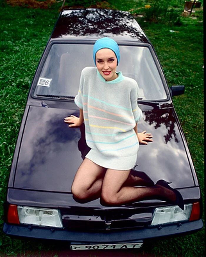 Актриса Анна Самохина позирует на капоте лады, 1990 год.