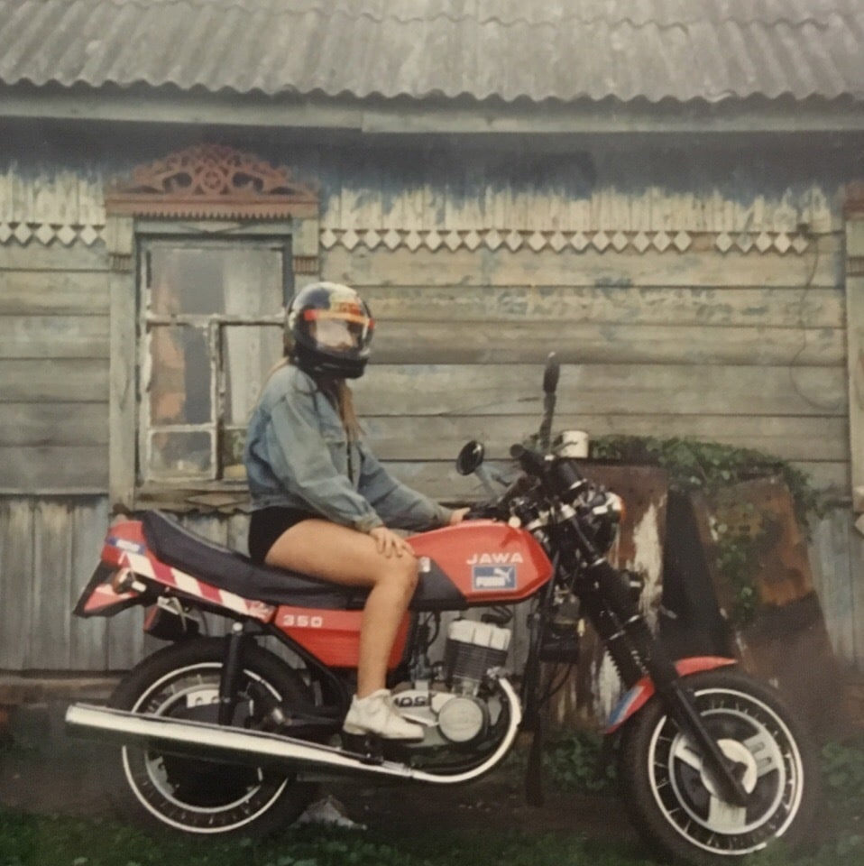 Девушка на мотоцикле «Jawa». Россия, 1990-е годы.