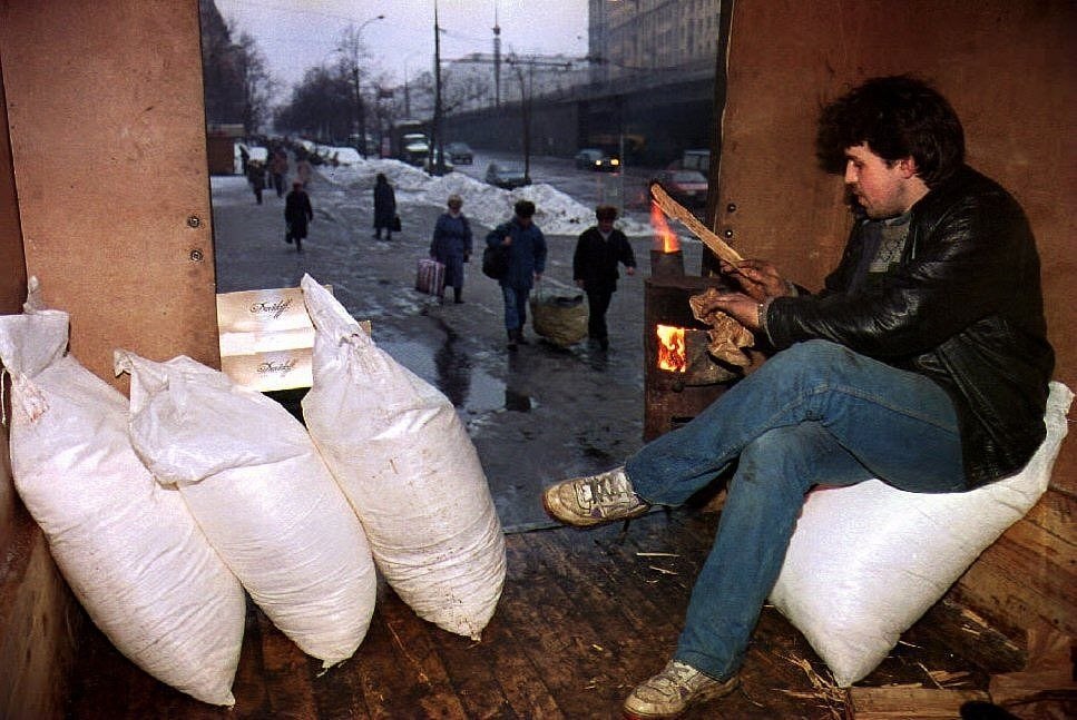 Продавец в задней части грузовика рядом с дровяной печью продает мешки с сахаром в Москве. Они продаются за 26 000 рублей (20 долларов США) за мешок. 17 декабря 1993 года.