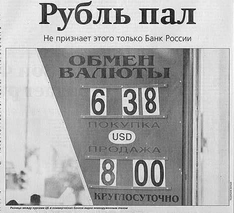 Курс доллара в 1998 году в самом начале дефолта. 8 рублей за доллар — это уже казалось «падением».