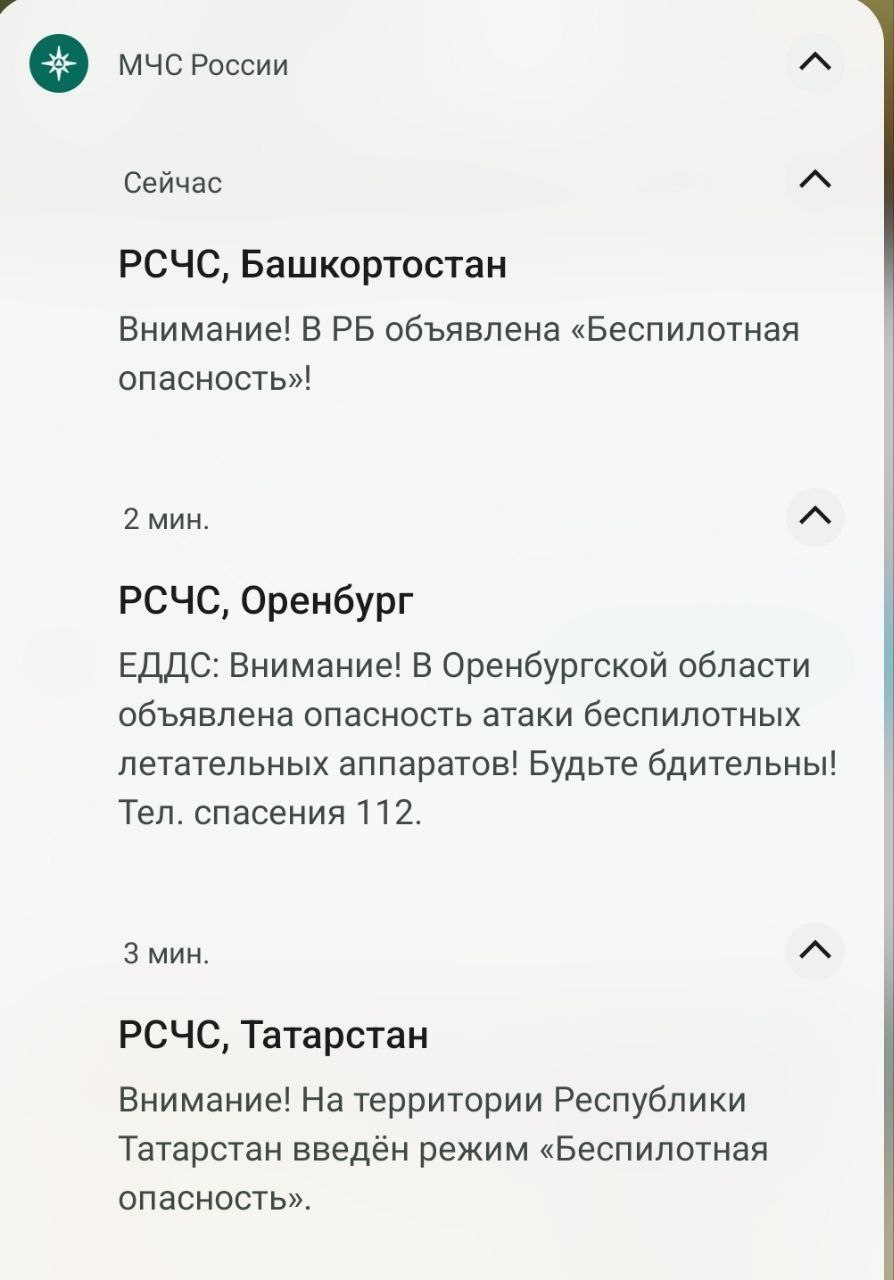 ⚠️**Угроза атаки БПЛА объявлена сразу в Оренбуржье, Башкирии и Татарстане !**