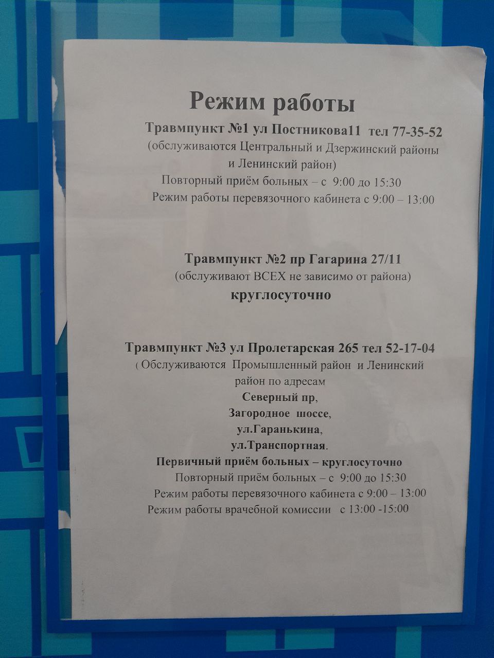 Для тех кому, вдруг понадобится вот фото со стенда на двери травмпункта 4 гор (но лучше, чтобы не понадобилось никогда). На Постникова 11 - НЕТ первичного приёма. Всех оттуда отправляют в ближайшую 4 городскую.