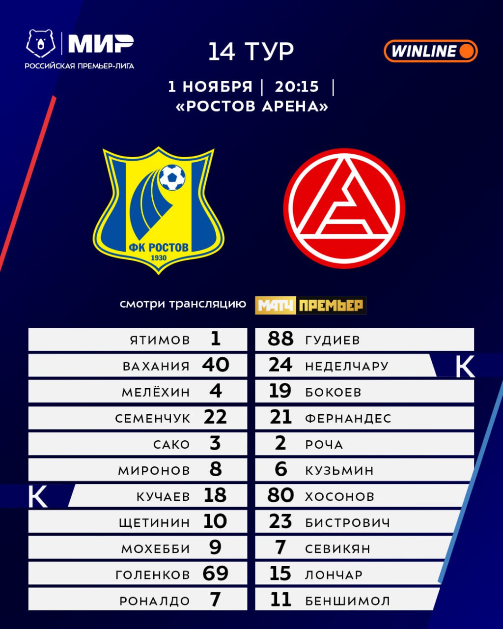 На игру [«Ростов» — «Акрон»](https://matchtv.ru/football/rpl/552400816-rostov-akron-01-11-2025) 📲