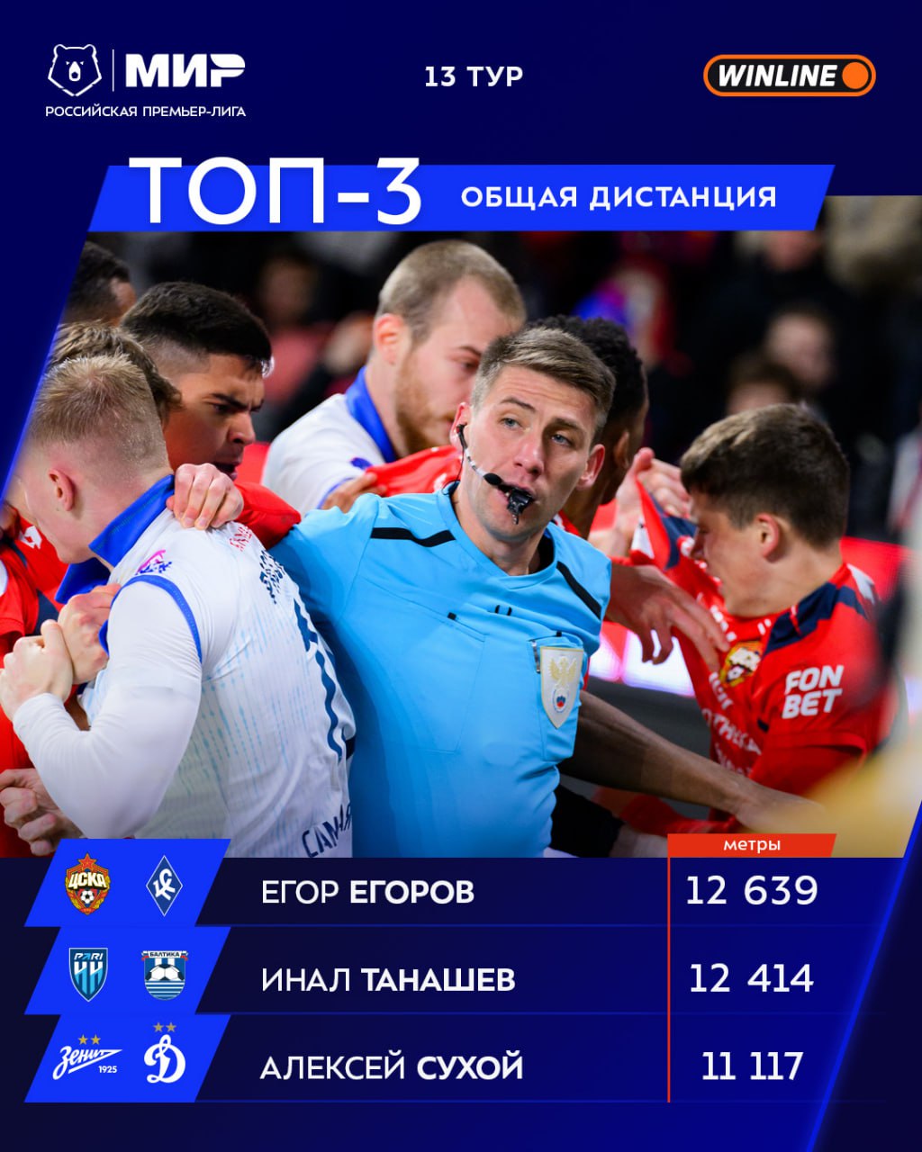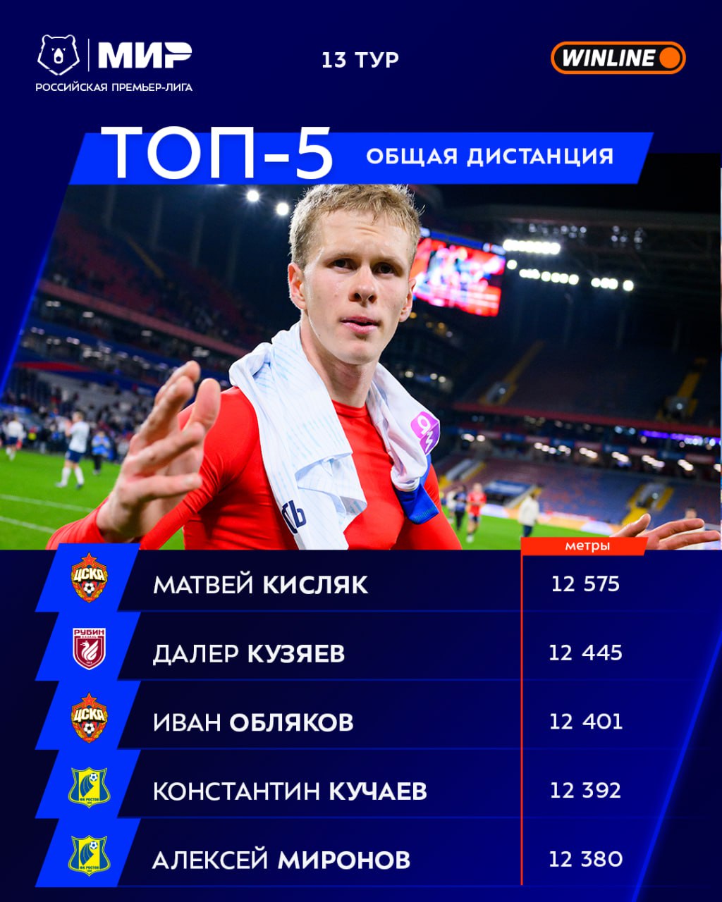 Армейцы часто попадают в наши топы по фитнес-показателям, 13-й тур не исключение — Матвей Кисляк пробежал больше всех в туре, Иван Обляков на третьем месте 🏃♂️