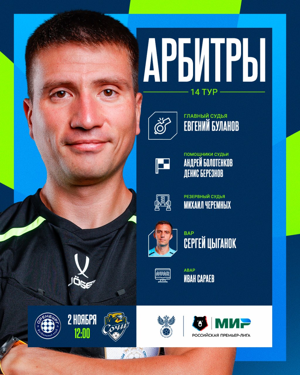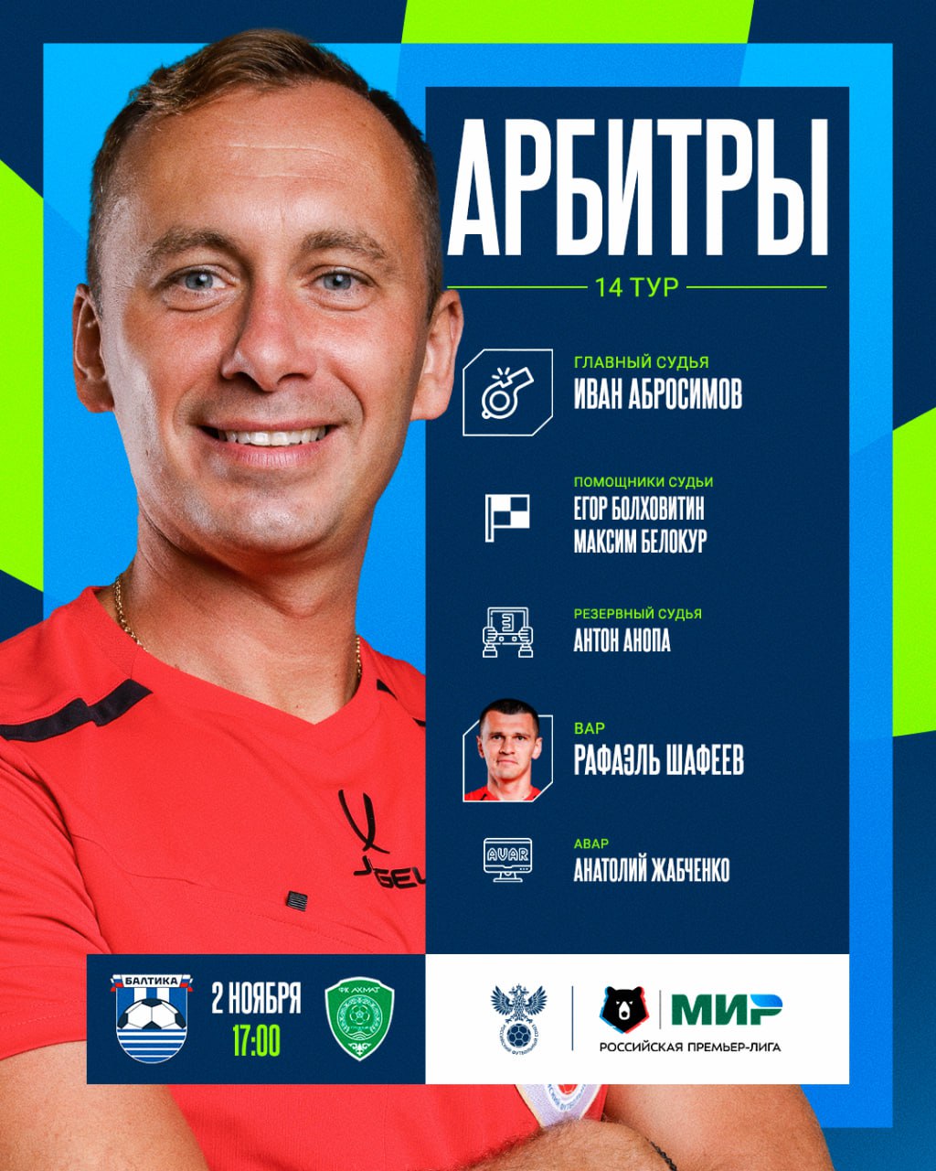 Назначения судей на 14-й тур [Мир РПЛ](https://t.me/premierliga) уже в карточках и на сайте: [rfs.ru/news/223326](https://www.rfs.ru/news/223326)