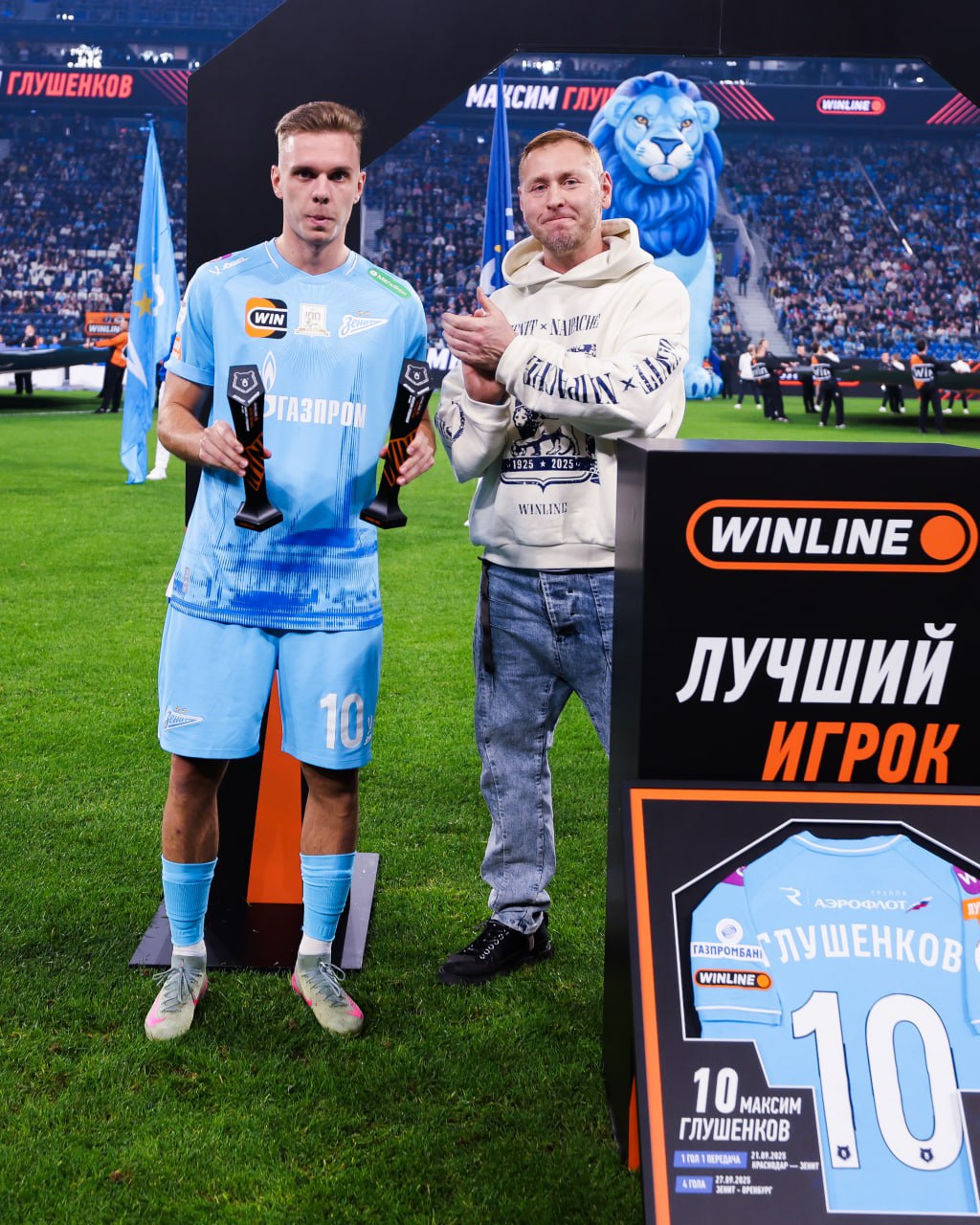 Фабио Челестини получил награду WINLINE Тренеру сентября перед игрой с «Крыльями», а Максим Глушенков — призы WINLINE Игрока месяца и WINLINE Гол месяца перед матчем с «Динамо» 💪