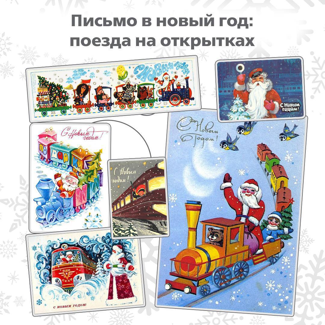 Когда в Россию пришла традиция праздничных открыток, на них, наряду с христианскими сюжетами и зимними пейзажами, уже встречались поезда, несущиеся навстречу Новому году. Особенно популярны были сюжеты, где в кабине паровоза сидел сам Дед Мороз.