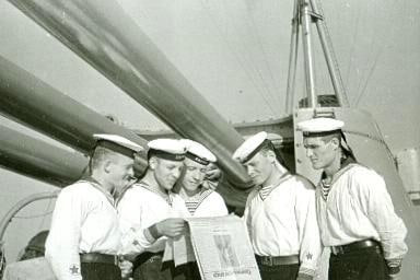 1940 год. Краснофлотцы крейсера "Киров" Балтийского флота читают газету.