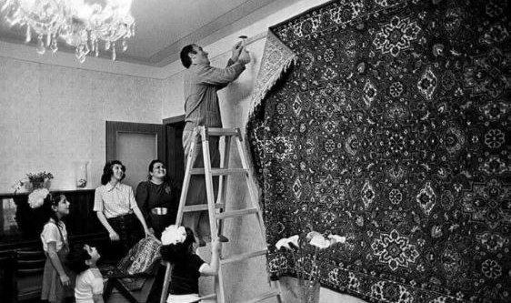 Глава семьи вешает ковёр под восторженными взглядами всех домочадцев.