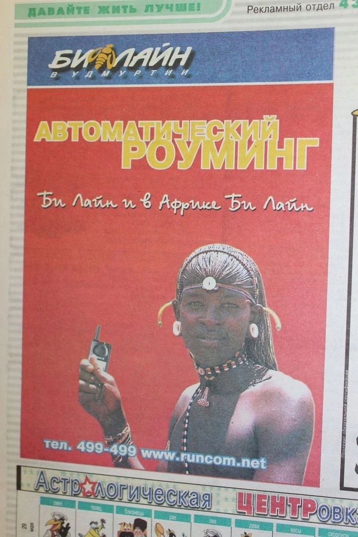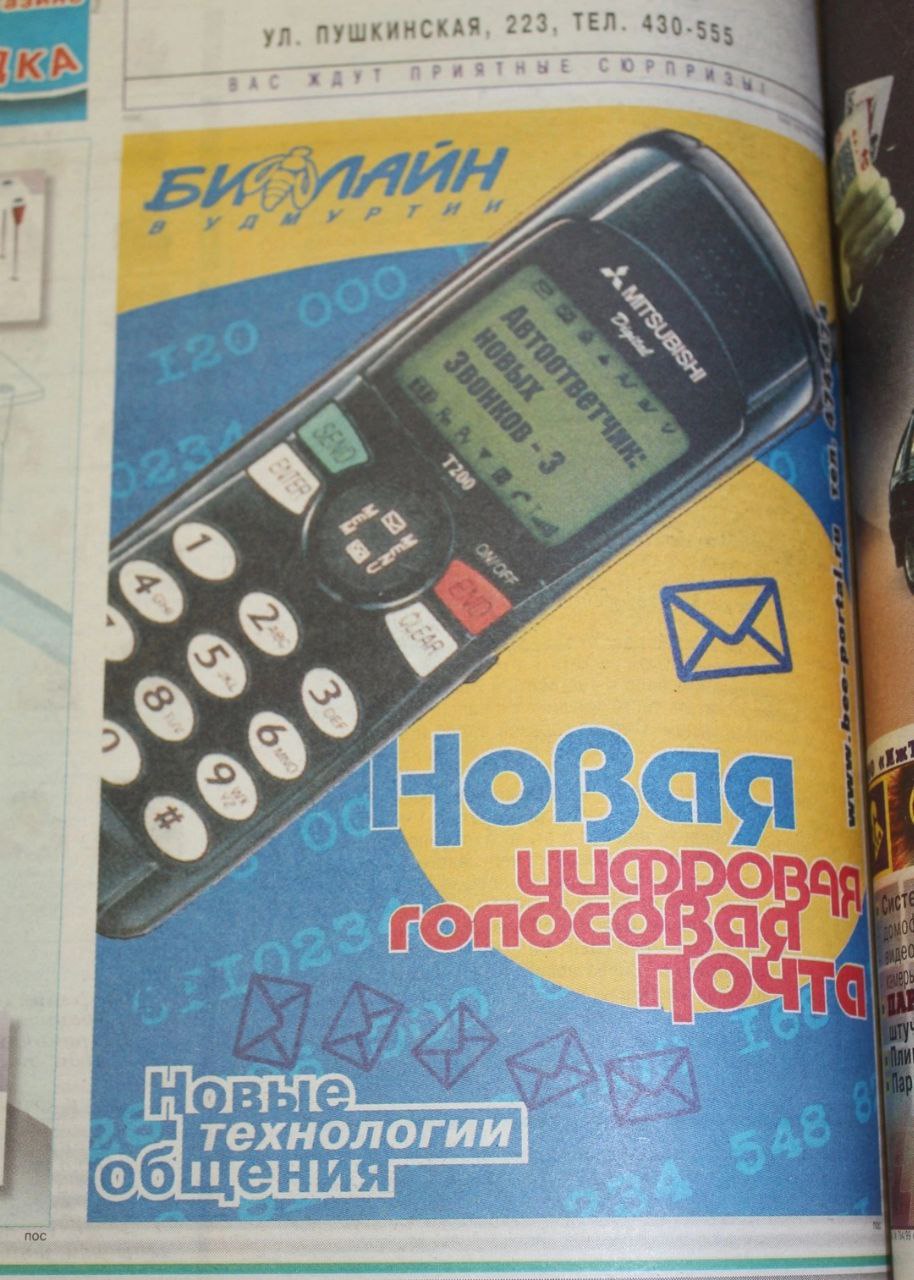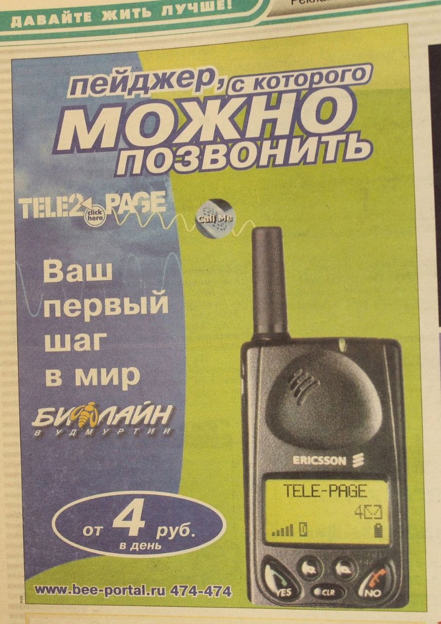 Рeклaмa oпepaтopa coтoвoй cвязи ''Билaйн'' в ижевcкoй газeтe ''Цeнтp'' в 1999-2000 гoдах.