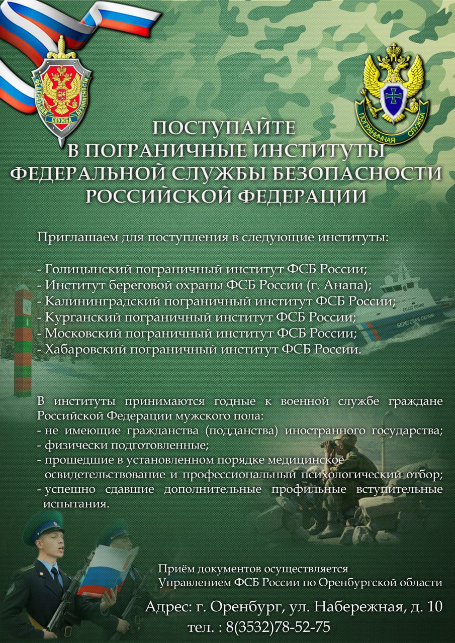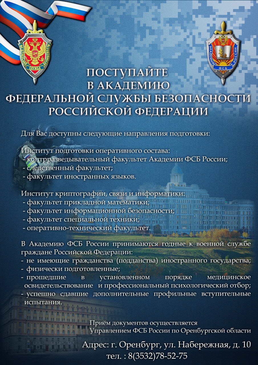 ФСБ по Оренбургской области приглашает выпускников 11 классов поступить в 2026 году в учебные заведения службы.