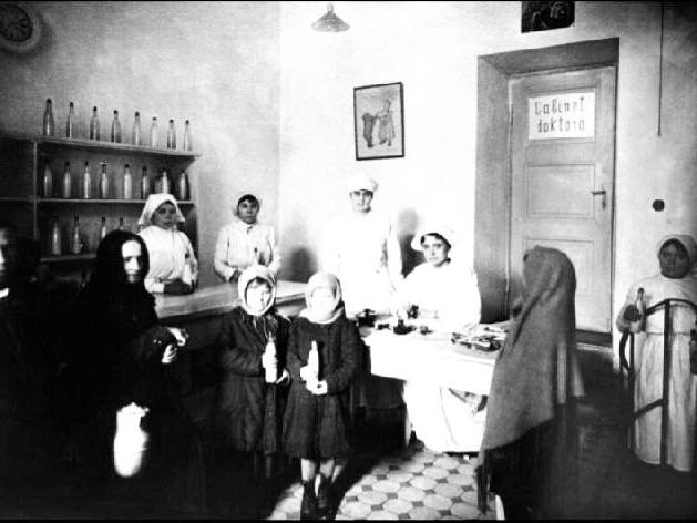 Работники благотворительного молочного пункта "Капля молока" раздают еду голодающим детям, Минск, 1915 год.