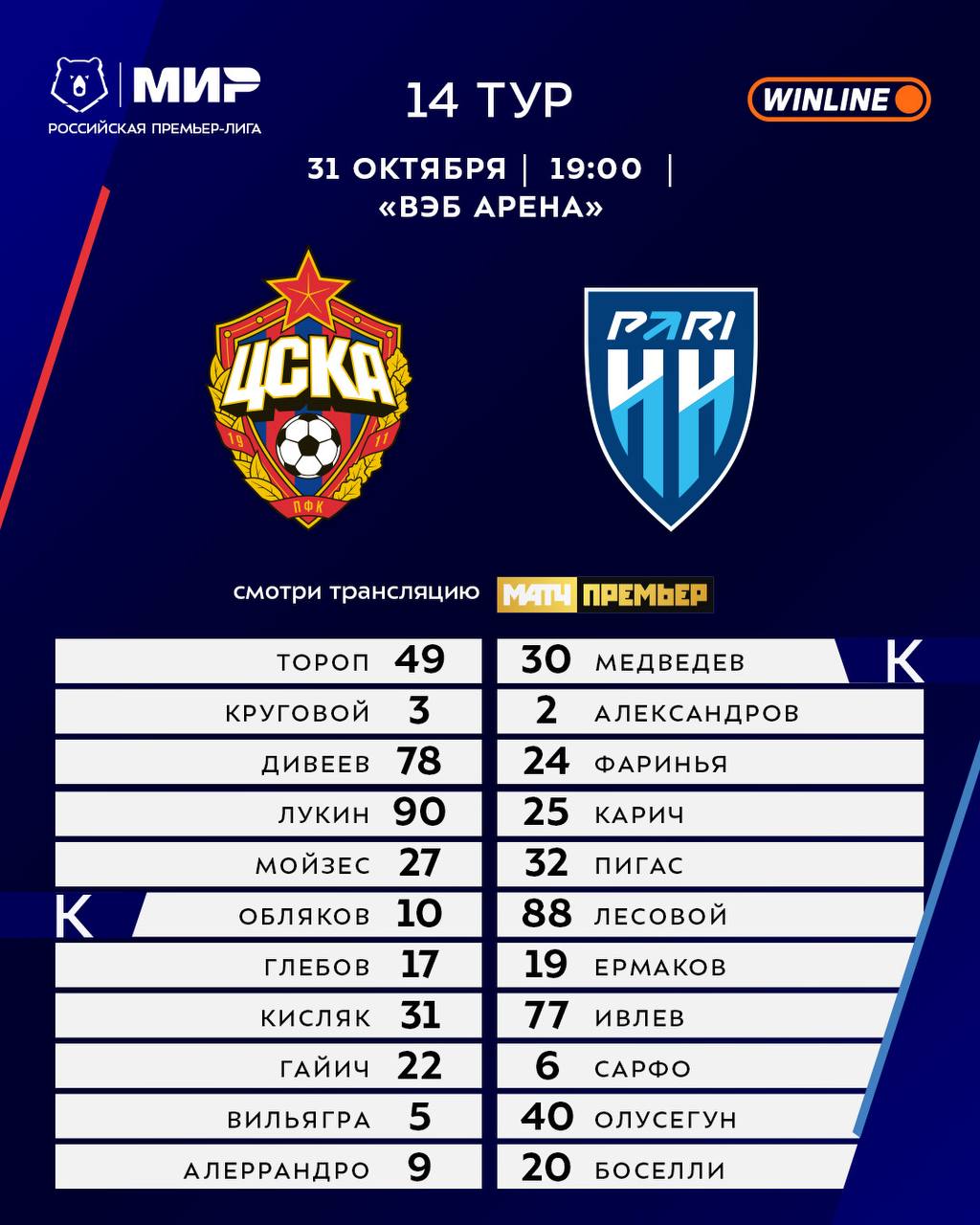Стартовые составы матча #ЦСКАПариНН перед вами.