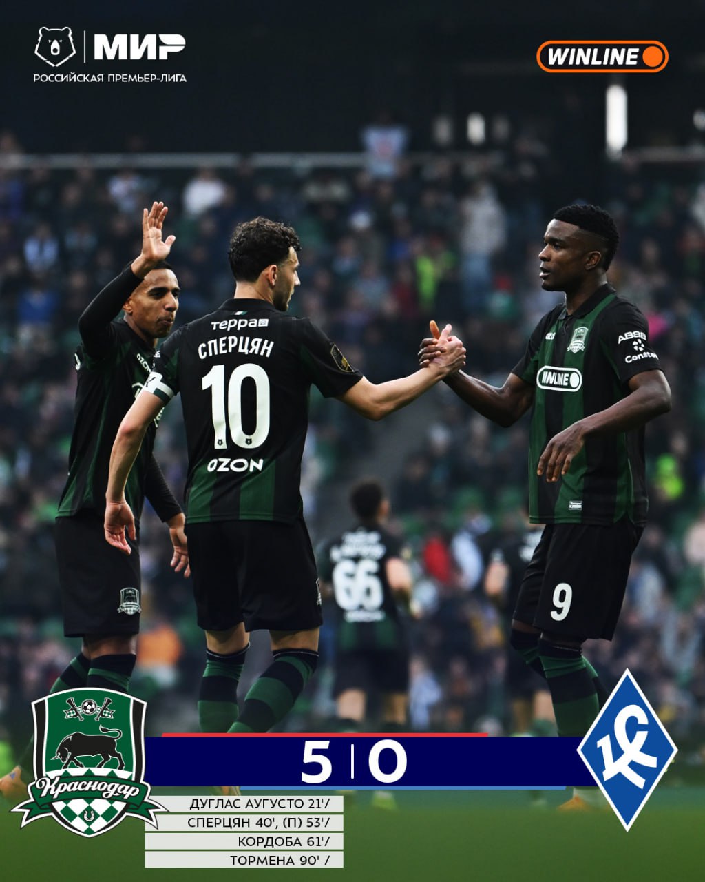 «Краснодар» учинил разгром «Крыльям». Дубль у Сперцяна, клубный рекорд у Кордобы, зарезервированное первое место у «быков» 💪